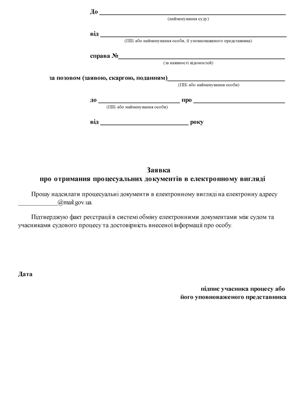 Після успішної реєстрації в системі обміну електронними документами між судом та учасниками судового процесу для отримання документів в електронному вигляді до суду необхідно подати заявку про отримання процесуальних документів в електронному вигляді по конкретній справі, яку необхідно роздрукувати на офіційному веб-порталі судової влади України у вищевказаному розділі. Процесуальні документи в електронному вигляді по відповідній справі будуть надходити на зареєстровану електронну адресу учасника судового процесу в домені mail.gov.ua, зазначену в Заявці.