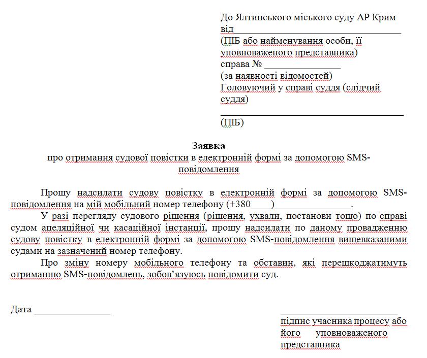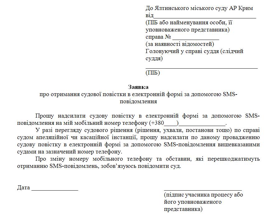 Заявка про отримання судової повістки в електронній формі за допомогою SMS-повідомлення